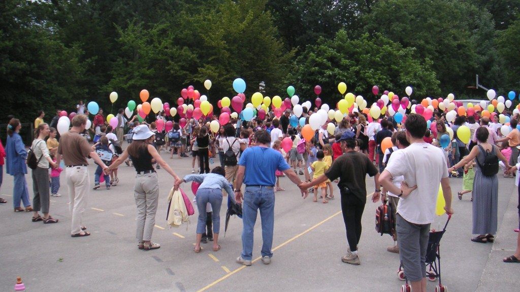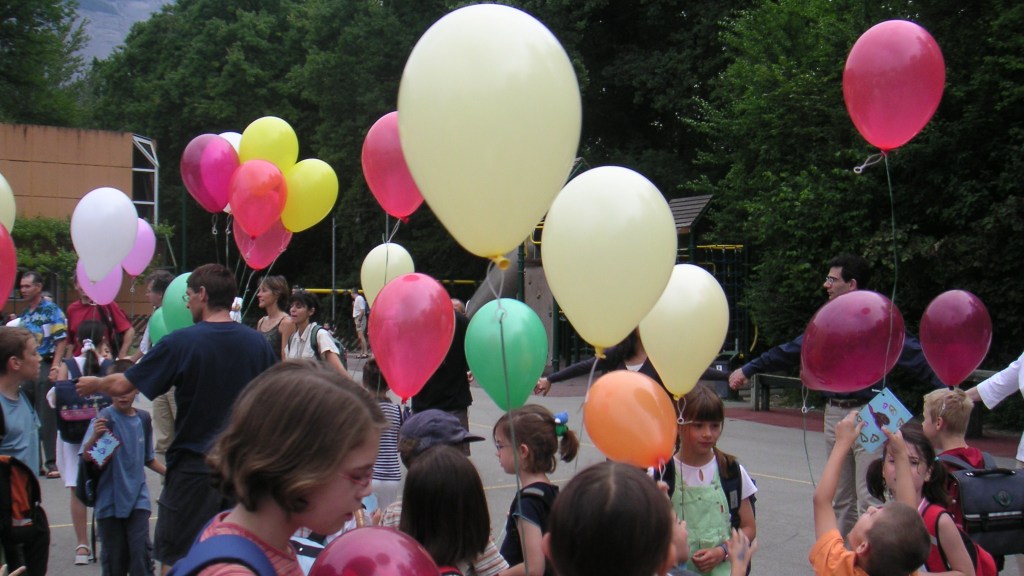 Le samedi 19 juin au matin, l’école primaire et l’Union de Quartier organisaient un lâcher de ballons. Durant la matinée, chaque élève avait composé son propre message sur un petit carton bleu portant l’adresse de l’école. On y parlait des 20 ans du quartier. Chacun avait illustré ses quelques lignes, témoins du présent et messages d’espoir pour le futur d’un quartier plein de vie que chacun apprécie.