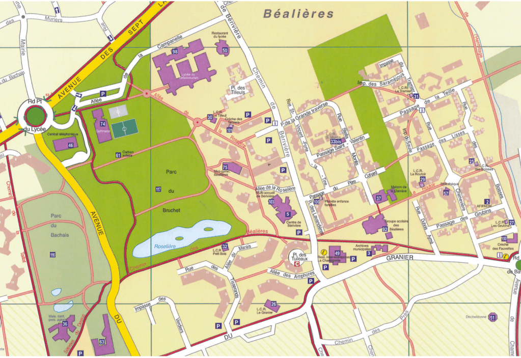 Voici un plan datant de l’époque de la construction des Béalières, qui permet de visualiser le quartier, constitué des 4 secteurs Béal1, Béal2, Béal 3 et Béal 4 :