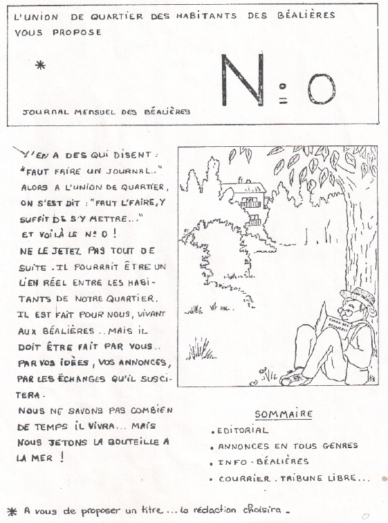 Et un matin (ou un après-midi) de 1987 est apparu dans les boites aux lettres un petit document, le numéro 0 du Journal mensuel des Béalières. Aucune équipe rédactionnelle n’est mentionnée et le contenu s’avère très succinct, 3 pages tapées à la machine. Un dessin sur la page de couverture et un bref éditorial annoncent l’heureux évènement, sollicitant la participation des habitants.