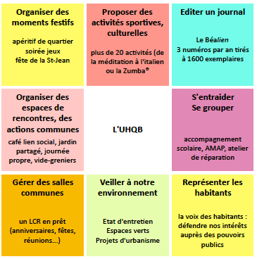 L’UHQB regroupe les familles qui souhaitent s’inscrire à une activité, organiser quelque chose dans le quartier, ou tout simplement nous soutenir : plus de 380 familles, avec plus de 540 inscriptions dans nos diverses activités.